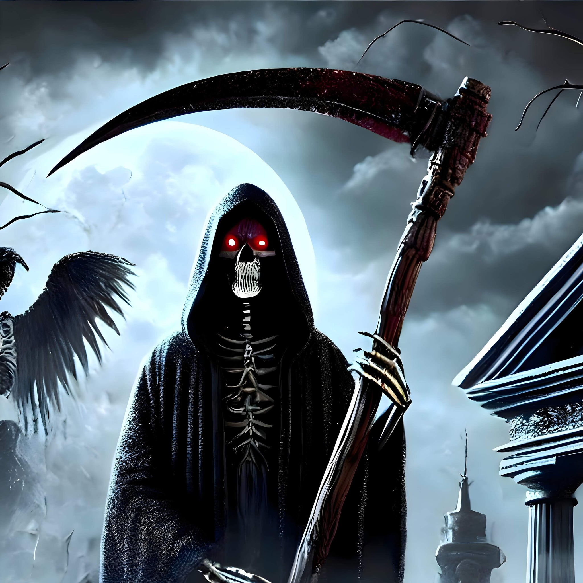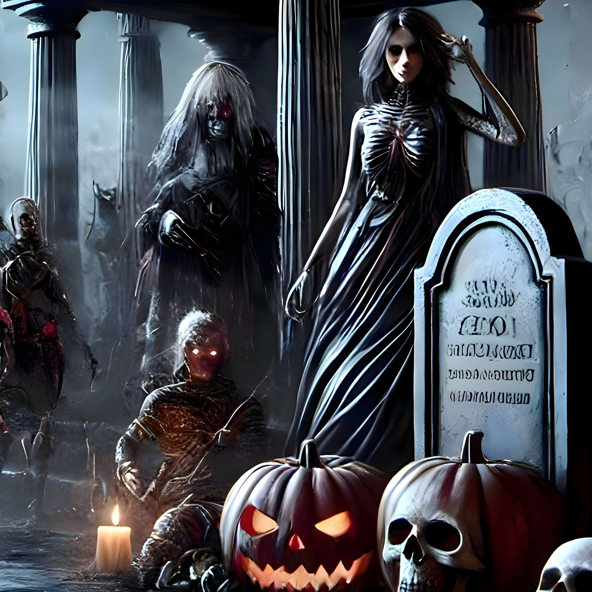 Immersive artwork: Multi-layered graveyard scene—pumpkins, skeletons, reaper, mausoleum, stormy sky