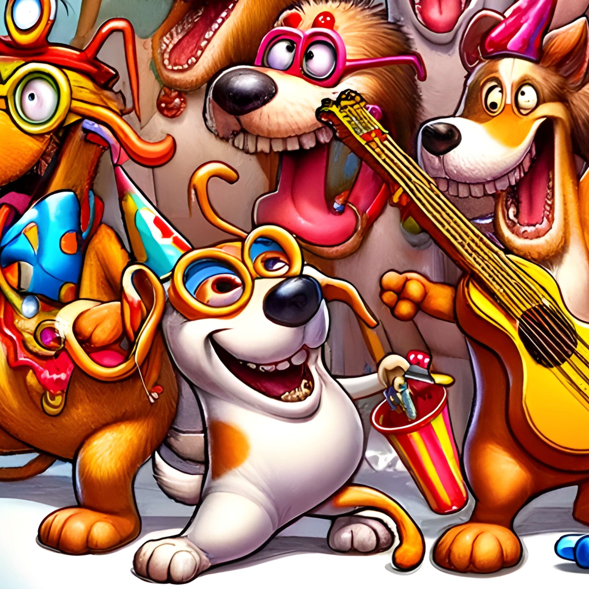 ·                     Theme/Style: Cartoon dogs, party celebration, colorful crowd scene