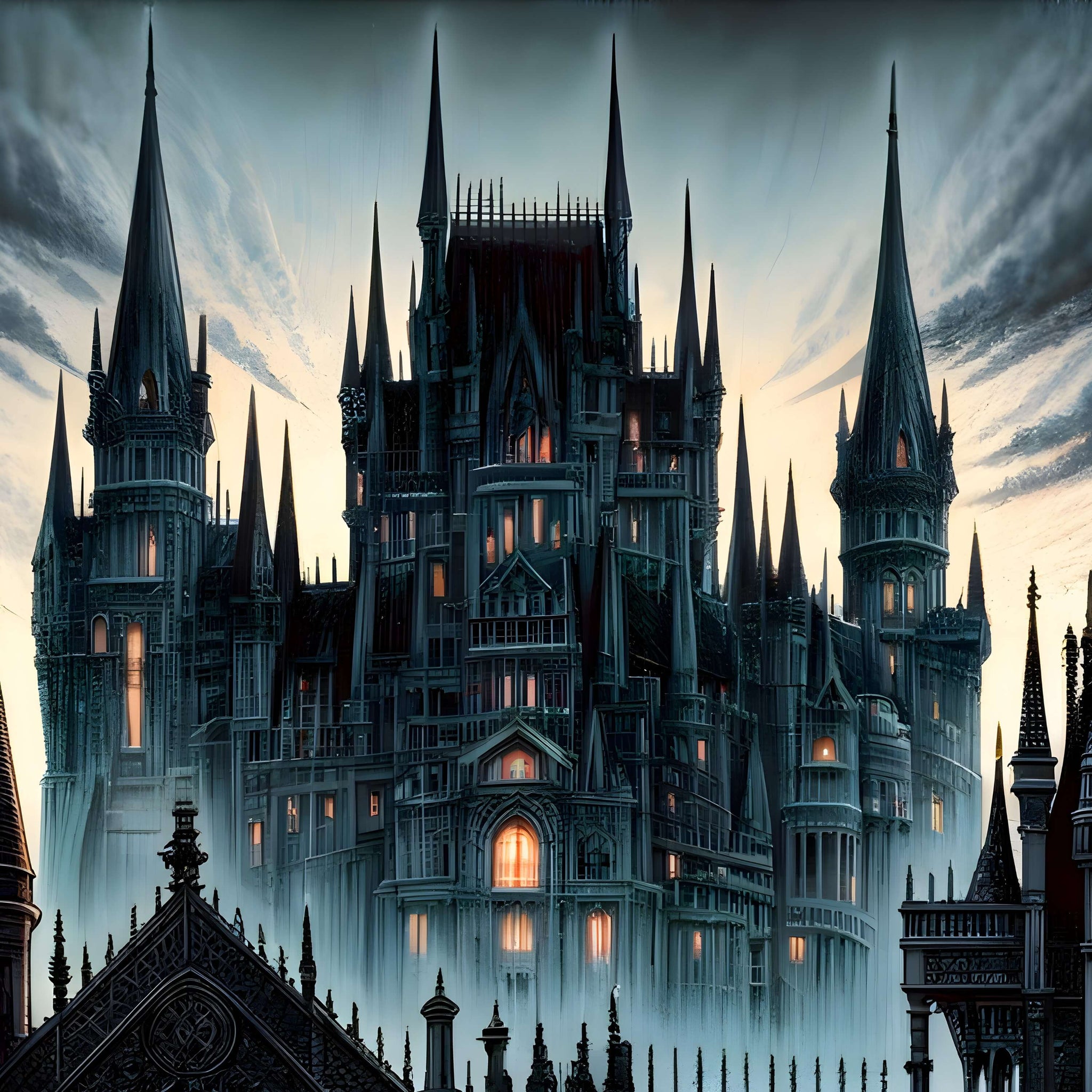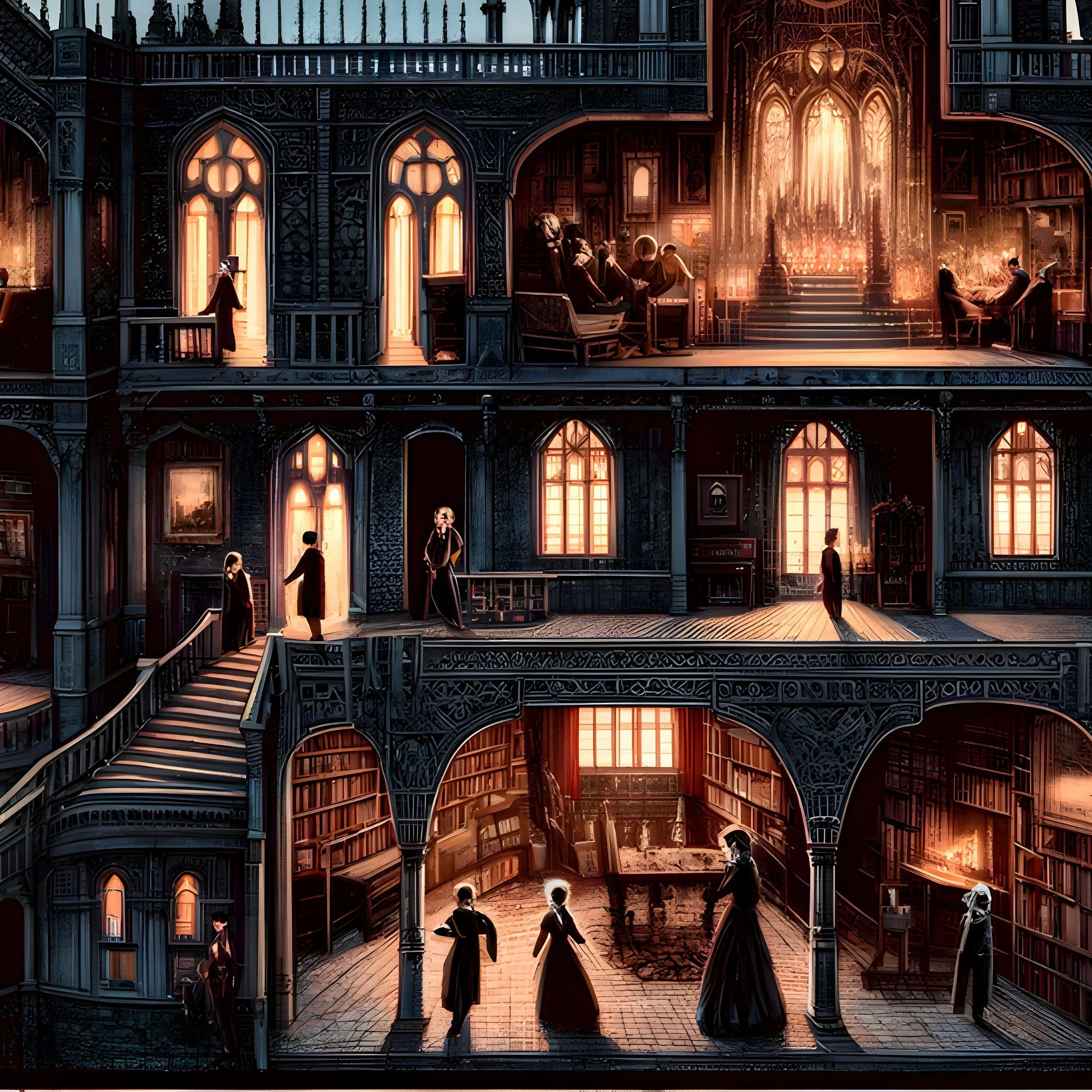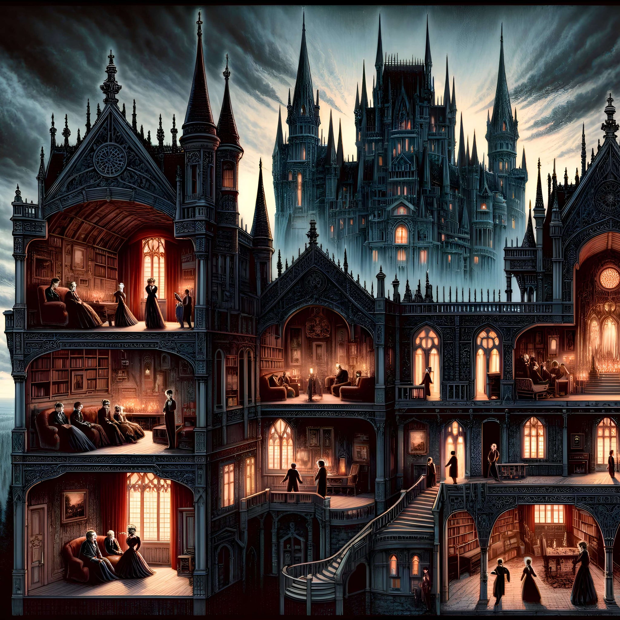 • Theme/Style: Gothic cathedral, dark fantasy, cutaway rooms, night scene