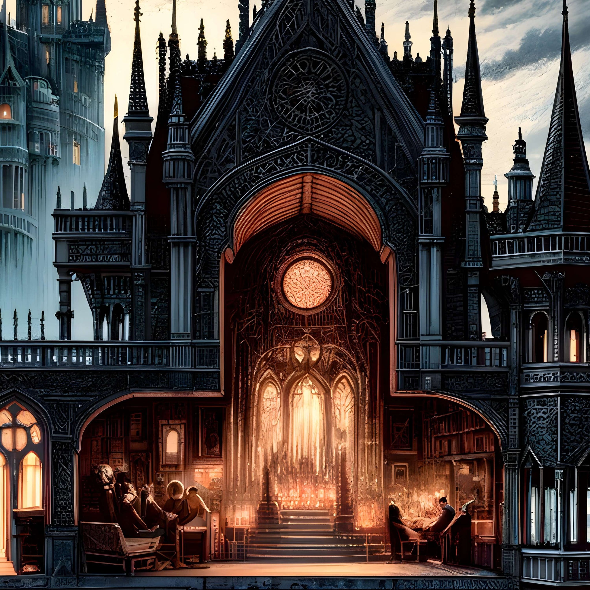 • Gothic cathedral, dark fantasy, cutaway rooms.