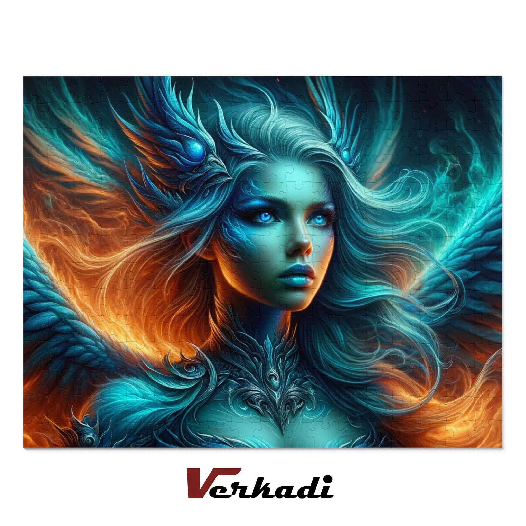 Step into an elemental world with Aqua flame Valkyrie, a stunning fantasy art adult jigsaw puzzle that blends the opposing forces of fire and ice. This 1000-piece masterpiece features a celestial warrior with flowing aqua-blue hair and blazing orange flames, designed for collectors and puzzlers who crave challenge and beauty in equal measures.