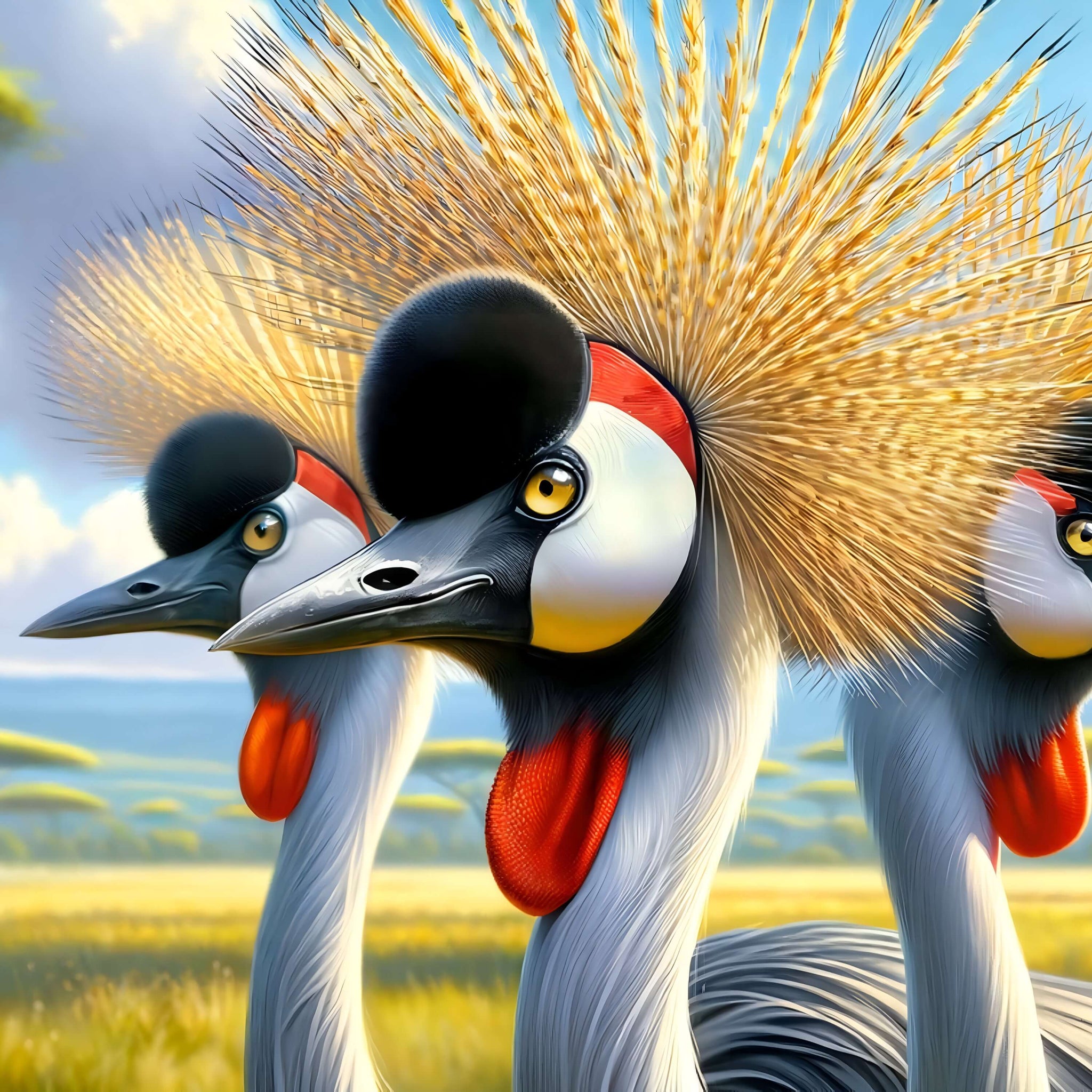 · Museum-grade artwork: Ultra-sharp illustration of African crowned cranes with lifelike feathers and golden crests.