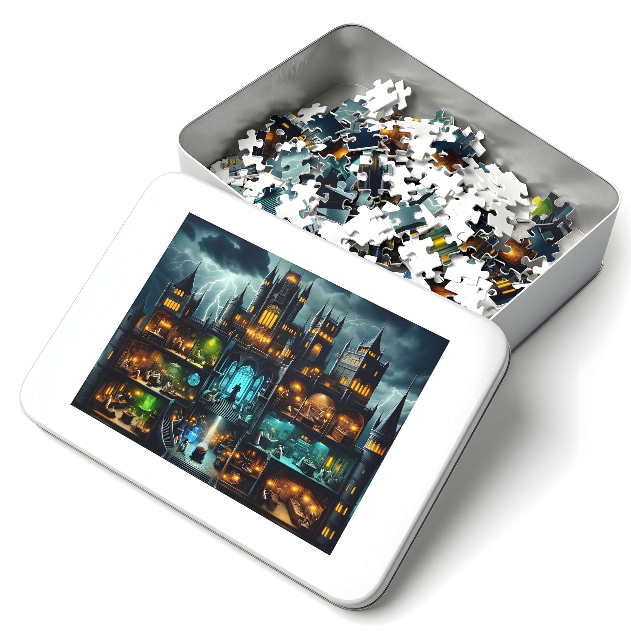 Unlock a storm-lit world with this 1000-piece adult jigsaw puzzle—the Gothic Alchemist Castle is a dark fantasy art cutaway filled with glowing laboratories, wizard chambers, and haunted castle towers. Crafted for fans of challenging puzzles for adults, it blends gothic architecture, alchemy, and cinematic detail into a premium, display-worthy build.