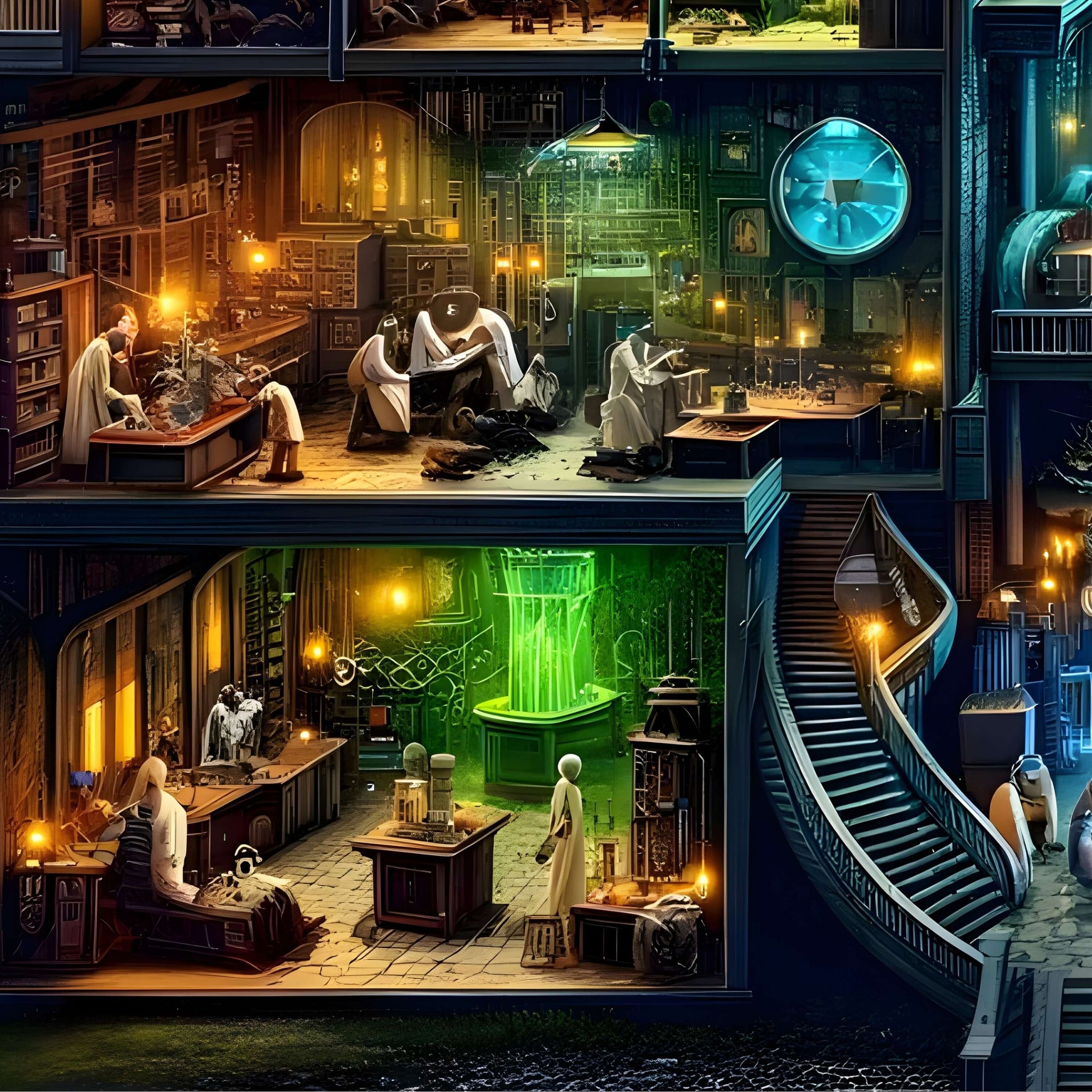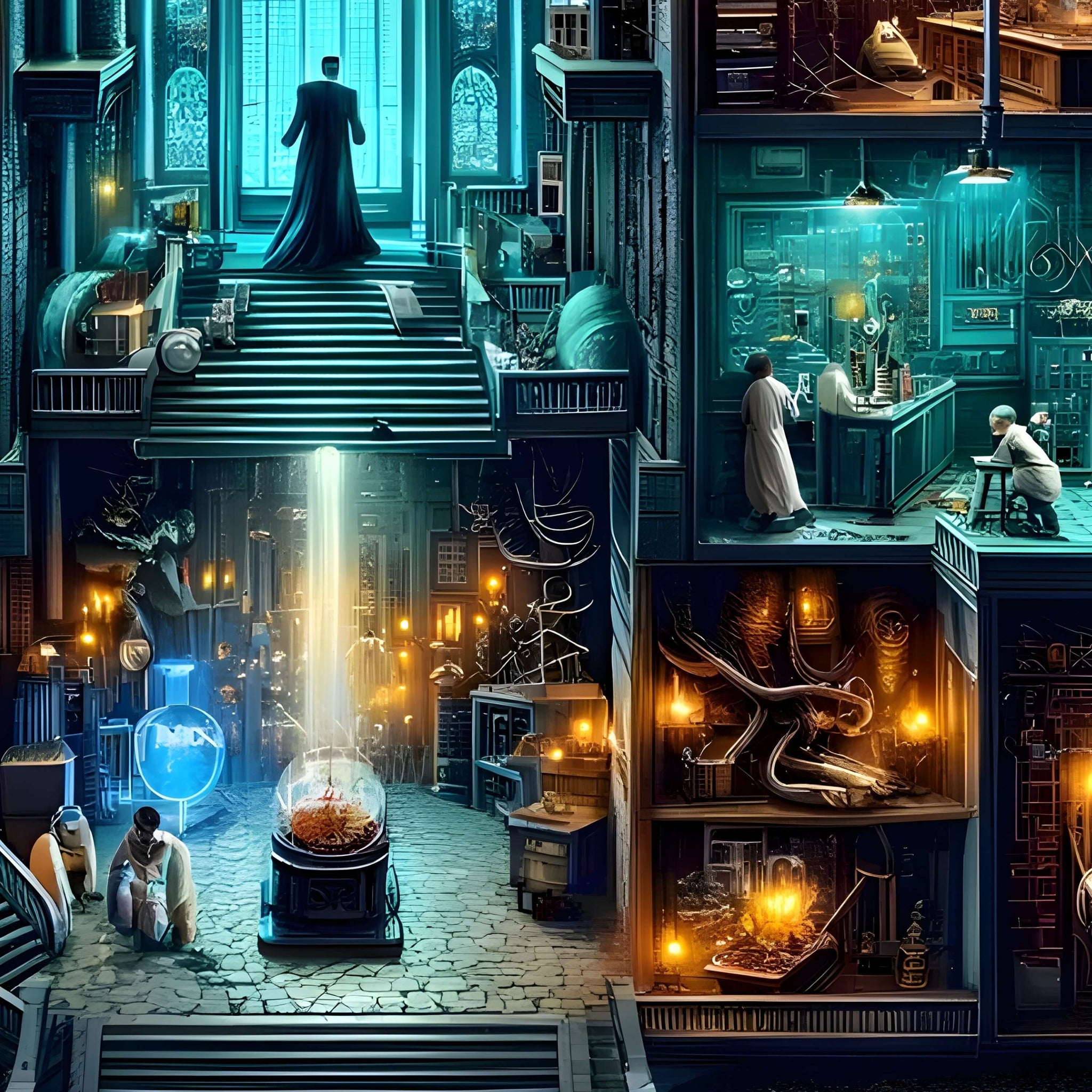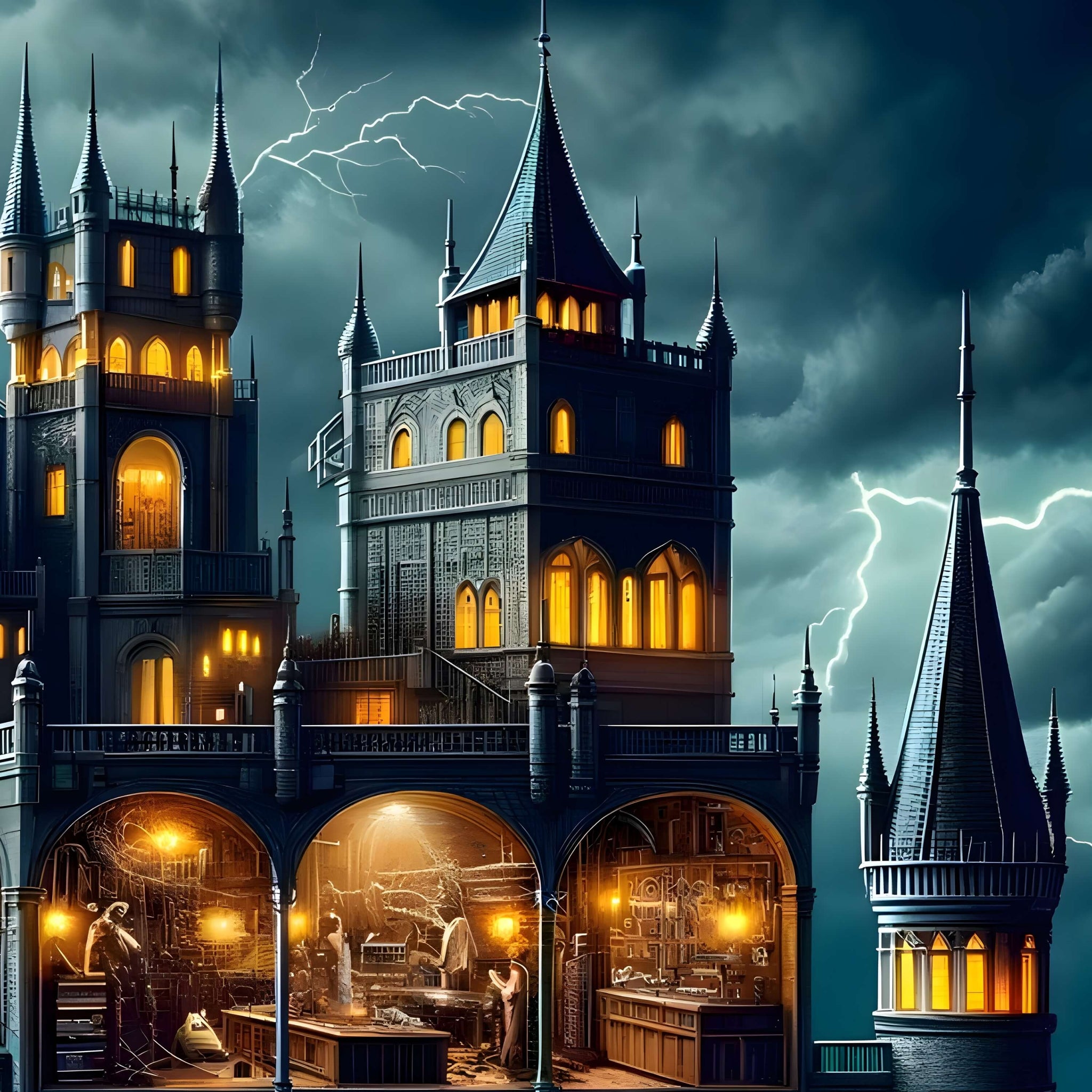 · Dark fantasy castle artwork: intricate gothic cutaway—labs, libraries, dungeons, and a grand hall under lightning.